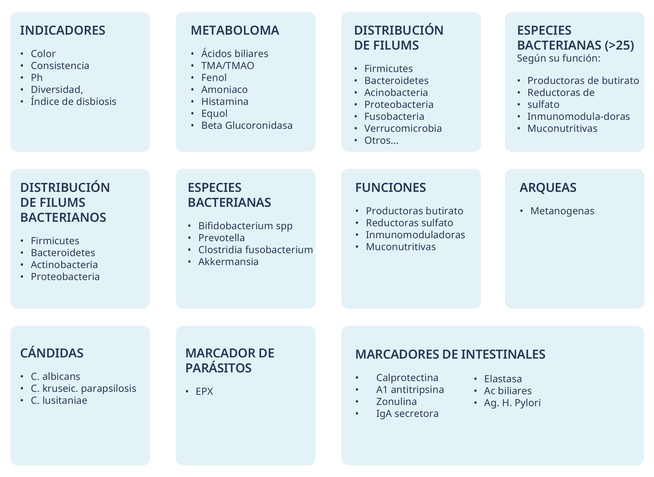 Nuestros tests de microbioma intestinal analizan la composición y diversidad de los microorganismos presentes en el intestino a partir de una muestra de heces. Esto nos permite evaluar tu microbiota, detectando desequilibrios (disbiosis) e identificando el origen de patologías relacionadas para personalizar pautas nutricionales y tratamientos. Disponemos de 2 tests: General y Avanzado.